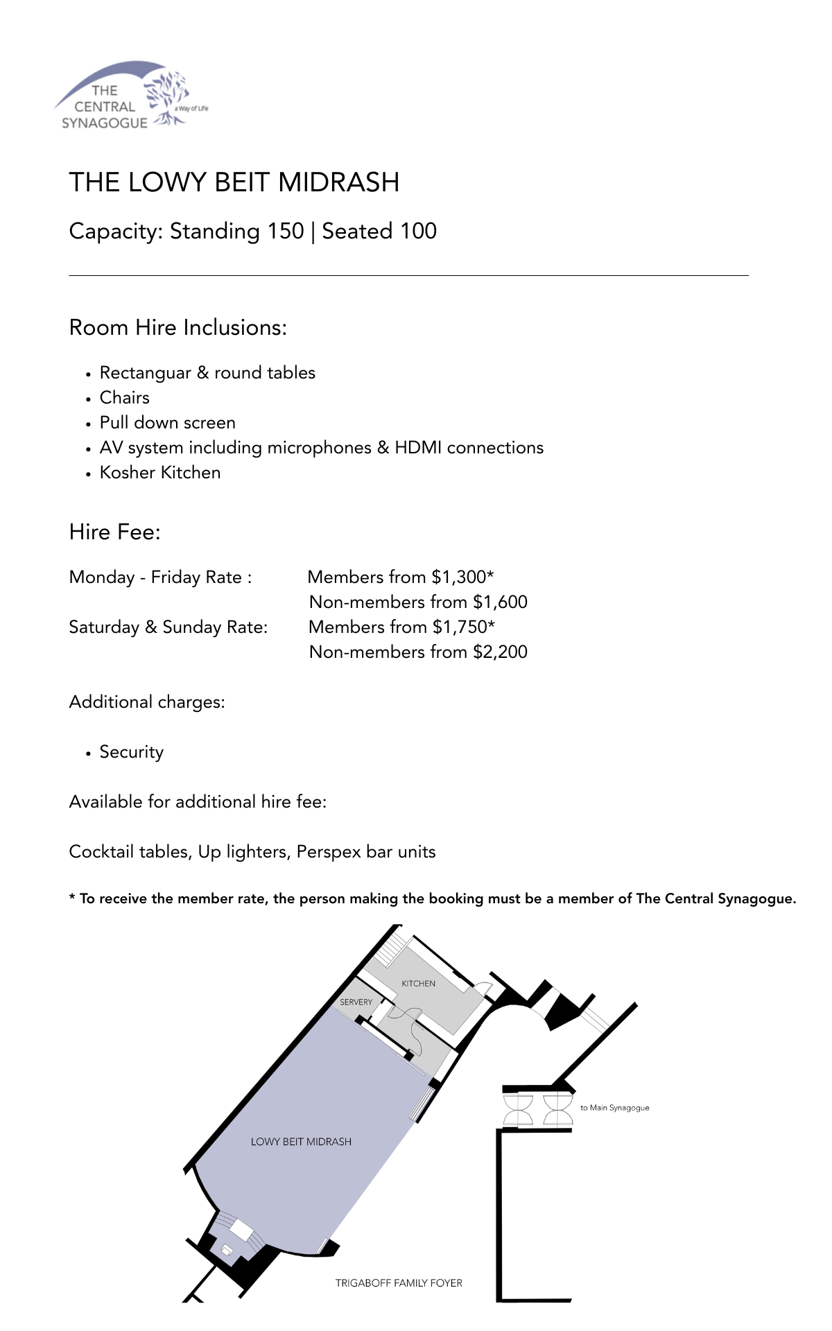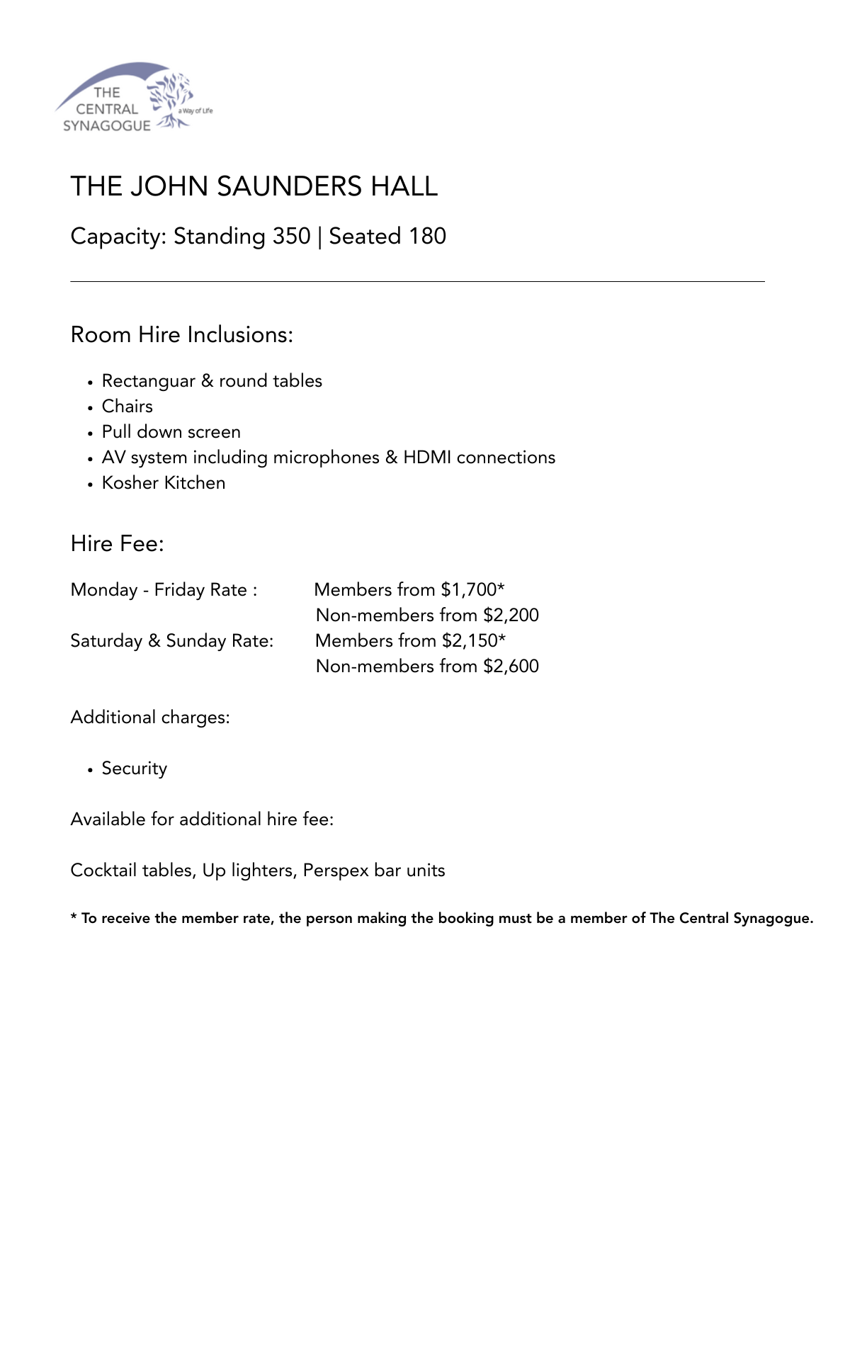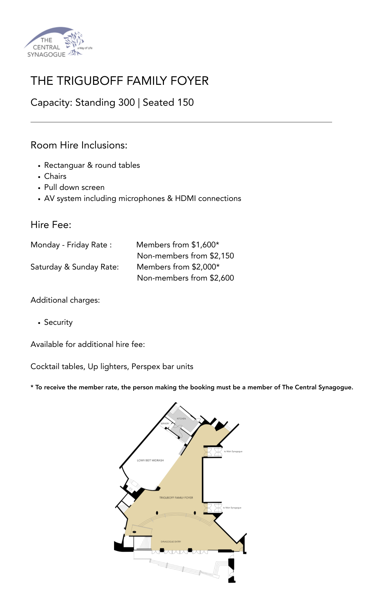 For more information or to help find the right space for your next event, please contact Mandy Mattes on 02 9355 4040 / email: mandy@centralsynagogue.com.au or complete the form below.